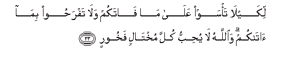 23. Likayla ta/saw AAala ma fatakum wala tafrahoo bima atakum waAllahu la yuhibbu kulla mukhtalin fakhoorin