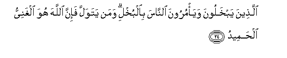 24. Allatheena yabkhaloona waya/muroona alnnasa bialbukhli waman yatawalla fa-inna Allaha huwa alghaniyyu alhameedu