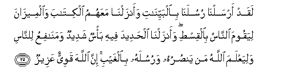 25. Laqad arsalna rusulana bialbayyinati waanzalna maAAahumu alkitaba waalmeezana liyaqooma alnnasu bialqisti waanzalna alhadeeda feehi ba/sun shadeedun wamanafiAAu lilnnasi waliyaAAlama Allahu man yansuruhu warusulahu bialghaybi inna Allaha qawiyyun AAazeezun