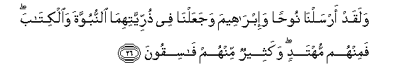 26. Walaqad arsalna noohan wa-ibraheema wajaAAalna fee thurriyyatihima alnnubuwwata waalkitaba faminhum muhtadin wakatheerun minhum fasiqoona