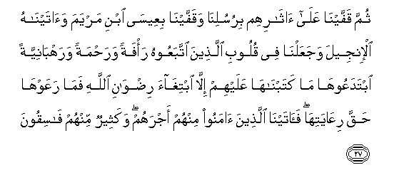 27. Thumma qaffayna AAala atharihim birusulina waqaffayna biAAeesa ibni maryama waataynahu al-injeela wajaAAalna fee quloobi allatheena ittabaAAoohu ra/fatan warahmatan warahbaniyyatan ibtadaAAooha ma katabnaha AAalayhim illa ibtighaa ridwani Allahi fama raAAawha haqqa riAAayatiha faatayna allatheena amanoo minhum ajrahum wakatheerun minhum fasiqoona