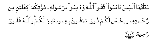 28. Ya ayyuha allatheena amanoo ittaqoo Allaha waaminoo birasoolihi yu/tikum kiflayni min rahmatihi wayajAAal lakum nooran tamshoona bihi wayaghfir lakum waAllahu ghafoorun raheemun