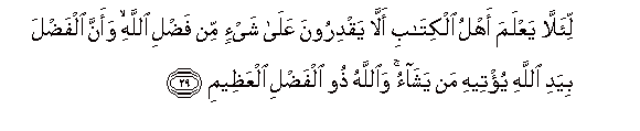 29. Li-alla yaAAlama ahlu alkitabi alla yaqdiroona AAala shay-in min fadli Allahi waanna alfadla biyadi Allahi yu/teehi man yashao waAllahu thoo alfadli alAAatheemi