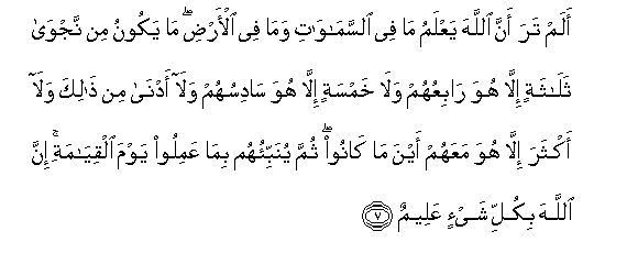 7. Alam tara anna Allaha yaAAlamu ma fee alssamawati wama fee al-ardi ma yakoonu min najwa thalathatin illa huwa rabiAAuhum wala khamsatin illa huwa sadisuhum wala adna min thalika wala akthara illa huwa maAAahum ayna ma kanoo thumma yunabbi-ohum bima AAamiloo yawma alqiyamati inna Allaha bikulli shay-in AAaleemun