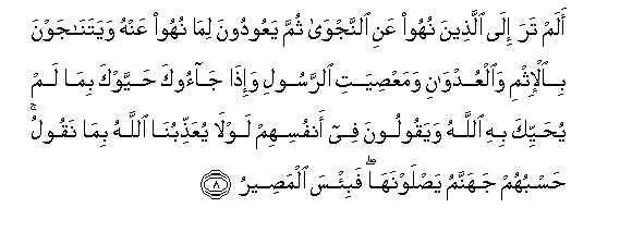8. Alam tara ila allatheena nuhoo AAani alnnajwa thumma yaAAoodoona lima nuhoo AAanhu wayatanajawna bial-ithmi waalAAudwani wamaAAsiyati alrrasooli wa-itha jaooka hayyawka bima lam yuhayyika bihi Allahu wayaqooloona fee anfusihim lawla yuAAaththibuna Allahu bima naqoolu hasbuhum jahannamu yaslawnaha fabi/sa almaseeru