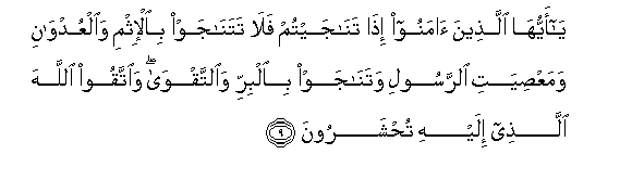 9. Ya ayyuha allatheena amanoo itha tanajaytum fala tatanajaw bial-ithmi waalAAudwani wamaAAsiyati alrrasooli watanajaw bialbirri waalttaqwa waittaqoo Allaha allathee ilayhi tuhsharoona