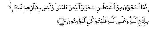 10. Innama alnnajwa mina alshshaytani liyahzuna allatheena amanoo walaysa bidarrihim shay-an illa bi-ithni Allahi waAAala Allahi falyatawakkali almu/minoona