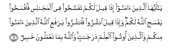 11. Ya ayyuha allatheena amanoo itha qeela lakum tafassahoo fee almajalisi faifsahoo yafsahi Allahu lakum wa-itha qeela onshuzoo faonshuzoo yarfaAAi Allahu allatheena amanoo minkum waallatheena ootoo alAAilma darajatin waAllahu bima taAAmaloona khabeerun