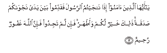12. Ya ayyuha allatheena amanoo itha najaytumu alrrasoola faqaddimoo bayna yaday najwakum sadaqatan thalika khayrun lakum waatharu fa-in lam tajidoo fa-inna Allaha ghafoorun raheemun