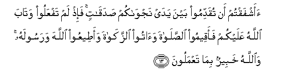 13. Aashfaqtum an tuqaddimoo bayna yaday najwakum sadaqatin fa-ith lam tafAAaloo wataba Allahu AAalaykum faaqeemoo alssalata waatoo alzzakata waateeAAoo Allaha warasoolahu waAllahu khabeerun bima taAAmaloona