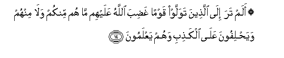 14. Alam tara ila allatheena tawallaw qawman ghadiba Allahu AAalayhim ma hum minkum wala minhum wayahlifoona AAala alkathibi wahum yaAAlamoona