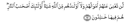 17. Lan tughniya AAanhum amwaluhum wala awladuhum mina Allahi shay-an ola-ika as-habu alnnari hum feeha khalidoona