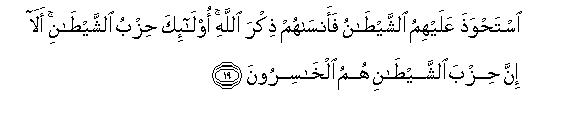 19. Istahwatha AAalayhimu alshshaytanu faansahum thikra Allahi ola-ika hizbu alshshaytani ala inna hizba alshshaytani humu alkhasiroona