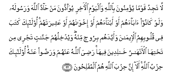 22. La tajidu qawman yu/minoona biAllahi waalyawmi al-akhiri yuwaddoona man hadda Allaha warasoolahu walaw kanoo abaahum aw abnaahum aw ikhwanahum aw AAasheeratahum ola-ika kataba fee quloobihimu al-eemana waayyadahum biroohin minhu wayudkhiluhum jannatin tajree min tahtiha al-anharu khalideena feeha radiya Allahu AAanhum waradoo AAanhu ola-ika hizbu Allahi ala inna hizba Allahi humu almuflihoona