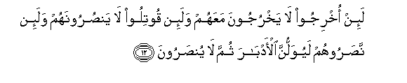 12. La-in okhrijoo la yakhrujoona maAAahum wala-in qootiloo la yansuroonahum wala-in nasaroohum layuwallunna al-adbara thumma la yunsaroona