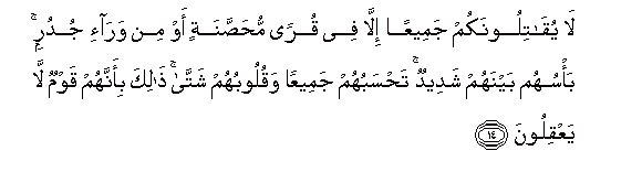 14. La yuqatiloonakum jameeAAan illa fee quran muhassanatin aw min wara-i judurin ba/suhum baynahum shadeedun tahsabuhum jameeAAan waquloobuhum shatta thalika bi-annahum qawmun la yaAAqiloona