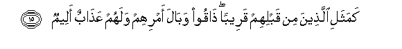 15. Kamathali allatheena min qablihim qareeban thaqoo wabala amrihim walahum AAathabun aleemun