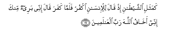 16. Kamathali alshshaytani ith qala lil-insani okfur falamma kafara qala innee baree-on minka innee akhafu Allaha rabba alAAalameena