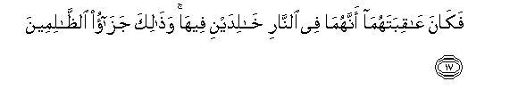 17. Fakana AAaqibatahuma annahuma fee alnnari khalidayni feeha wathalika jazao alththalimeena