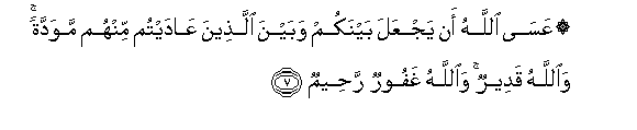 7. AAasa Allahu an yajAAala baynakum wabayna allatheena AAadaytum minhum mawaddatan waAllahu qadeerun waAllahu ghafoorun raheemun