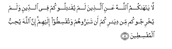 8. La yanhakumu Allahu AAani allatheena lam yuqatilookum fee alddeeni walam yukhrijookum min diyarikum an tabarroohum watuqsitoo ilayhim inna Allaha yuhibbu almuqsiteena