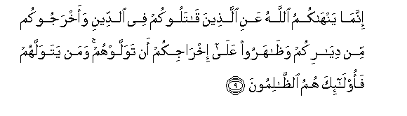 9. Innama yanhakumu Allahu AAani allatheena qatalookum fee alddeeni waakhrajookum min diyarikum wathaharoo AAala ikhrajikum an tawallawhum waman yatawallahum faola-ika humu alththalimoona