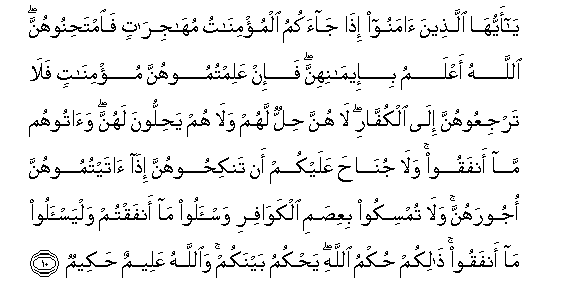 10. Ya ayyuha allatheena amanoo itha jaakumu almu/minatu muhajiratin faimtahinoohunna Allahu aAAlamu bi-eemanihinna fa-in AAalimtumoohunna mu/minatin fala tarjiAAoohunna ila alkuffari la hunna hillun lahum wala hum yahilloona lahunna waatoohum ma anfaqoo wala junaha AAalaykum an tankihoohunna itha ataytumoohunna ojoorahunna wala tumsikoo biAAisami alkawafiri wais-aloo ma anfaqtum walyas-aloo ma anfaqoo thalikum hukmu Allahi yahkumu baynakum waAllahu AAaleemun hakeemun
