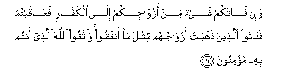 11. Wa-in fatakum shay-on min azwajikum ila alkuffari faAAaqabtum faatoo allatheena thahabat azwajuhum mithla ma anfaqoo waittaqoo Allaha allathee antum bihi mu/minoona