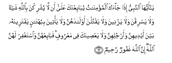 12. Ya ayyuha alnnabiyyu itha jaaka almu/minatu yubayiAAnaka AAala an la yushrikna biAllahi shay-an wala yasriqna wala yazneena wala yaqtulna awladahunna wala ya/teena bibuhtanin yaftareenahu bayna aydeehinna waarjulihinna wala yaAAseenaka fee maAAroofin fabayiAAhunna waistaghfir lahunna Allaha inna Allaha ghafoorun raheemun