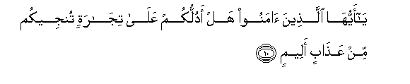 10. Ya ayyuha allatheena amanoo hal adullukum AAala tijaratin tunjeekum min AAathabin aleemin