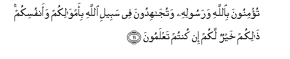 11. Tu/minoona biAllahi warasoolihi watujahidoona fee sabeeli Allahi bi-amwalikum waanfusikum thalikum khayrun lakum in kuntum taAAlamoona