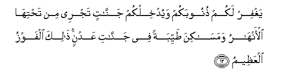 12. Yaghfir lakum thunoobakum wayudkhilkum jannatin tajree min tahtiha al-anharu wamasakina tayyibatan fee jannati AAadnin thalika alfawzu alAAatheemu
