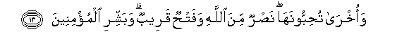 13. Waokhra tuhibboonaha nasrun mina Allahi wafathun qarreebun wabashshiri almu/mineena