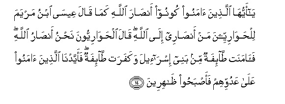 14. Ya ayyuha allatheena amanoo koonoo ansara Allahi kama qala AAeesa ibnu maryama lilhawariyyeena man ansaree ila Allahi qala alhawariyyoona nahnu ansaru Allahi faamanat ta-ifatun min banee isra-eela wakafarat ta-ifatun faayyadna allatheena amanoo AAala AAaduwwihim faasbahoo thahireena