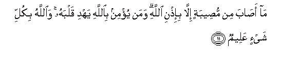 11. Ma asaba min museebatin illa bi-ithni Allahi waman yu/min biAllahi yahdi qalbahu waAllahu bikulli shay-in AAaleemun