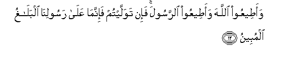 12. WaateeAAoo Allaha waateeAAoo alrrasoola fa-in tawallaytum fa-innama AAala rasoolina albalaghu almubeenu