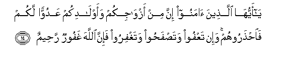 14. Ya ayyuha allatheena amanoo inna min azwajikum waawladikum AAaduwwan lakum faihtharoohum wa-in taAAfoo watasfahoo wataghfiroo fa-inna Allaha ghafoorun raheemun