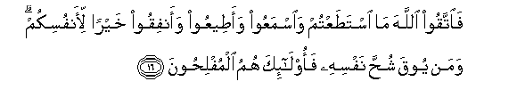 16. Faittaqoo Allaha ma istataAAtum waismaAAoo waateeAAoo waanfiqoo khayran li-anfusikum waman yooqa shuhha nafsihi faola-ika humu almuflihoona