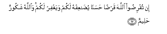 17. In tuqridoo Allaha qardan hasanan yudaAAifhu lakum wayaghfir lakum waAllahu shakoorun haleemun