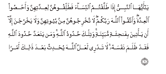 1. Ya ayyuha alnnabiyyu itha tallaqtumu alnnisaa fatalliqoohunna liAAiddatihinna waahsoo alAAiddata waittaqoo Allaha rabbakum la tukhrijoohunna min buyootihinna wala yakhrujna illa an ya/teena bifahishatin mubayyinatin watilka hudoodu Allahi waman yataAAadda hudooda Allahi faqad thalama nafsahu la tadree laAAalla Allaha yuhdithu baAAda thalika amran