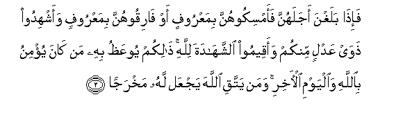 2. Fa-itha balaghna ajalahunna faamsikoohunna bimaAAroofin aw fariqoohunna bimaAAroofin waashhidoo thaway AAadlin minkum waaqeemoo alshshahadata lillahi thalikum yooAAathu bihi man kana yu/minu biAllahi waalyawmi al-akhiri waman yattaqi Allaha yajAAal lahu makhrajan