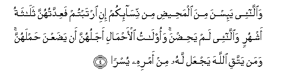 4. Waalla-ee ya-isna mina almaheedi min nisa-ikum ini irtabtum faAAiddatuhunna thalathatu ashhurin waalla-ee lam yahidna waolatu al-ahmali ajaluhunna an yadaAAna hamlahunna waman yattaqi Allaha yajAAal lahu min amrihi yusran
