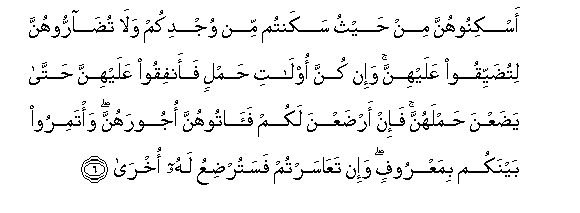 6. Askinoohunna min haythu sakantum min wujdikum wala tudarroohunna litudayyiqoo AAalayhinna wa-in kunna olati hamlin faanfiqoo AAalayhinna hatta yadaAAna hamlahunna fa-in ardaAAna lakum faatoohunna ojoorahunna wa/tamiroo baynakum bimaAAroofin wa-in taAAasartum fasaturdiAAu lahu okhra
