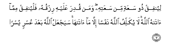 7. Liyunfiq thoo saAAatin min saAAatihi waman qudira AAalayhi rizquhu falyunfiq mimma atahu Allahu la yukallifu Allahu nafsan illa ma ataha sayajAAalu Allahu baAAda AAusrin yusran