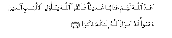 10. aAAadda Allahu lahum AAathaban shadeedan faittaqoo Allaha ya olee al-albabi allatheena amanoo qad anzala Allahu ilaykum thikran
