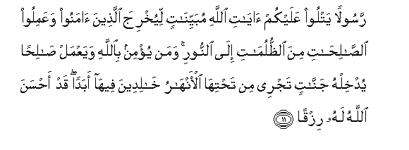 11. Rasoolan yatloo AAalaykum ayati Allahi mubayyinatin liyukhrija allatheena amanoo waAAamiloo alssalihati mina alththulumati ila alnnoori waman yu/min biAllahi wayaAAmal salihan yudkhilhu jannatin tajree min tahtiha al-anharu khalideena feeha abadan qad ahsana Allahu lahu rizqan