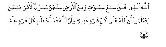 12. Allahu allathee khalaqa sabAAa samawatin wamina al-ardi mithlahunna yatanazzalu al-amru baynahunna litaAAlamoo anna Allaha AAala kulli shay-in qadeerun waanna Allaha qad ahata bikulli shay-in AAilman