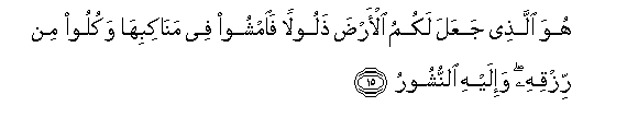 15. Huwa allathee jaAAala lakumu al-arda thaloolan faimshoo fee manakibiha wakuloo min rizqihi wa-ilayhi alnnushooru