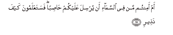 17. Or do ye feel secure that He Who is in Heaven will not send against you a violent tornado (with showers of stones), so that ye shall know how (terrible) was My warning?