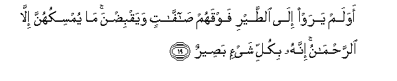 19. Awa lam yaraw ila alttayri fawqahum saffatin wayaqbidna ma yumsikuhunna illa alrrahmanu innahu bikulli shay-in baseerun